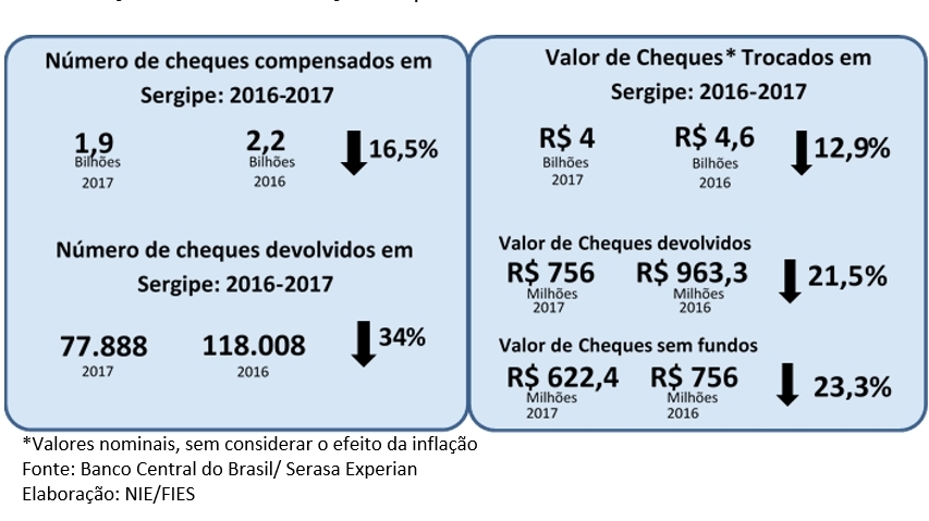 Análise realizada pelo Boletim Sergipe Econômico, parceria do Núcleo de Informações Econômicas (NIE) da Federação das Indústrias do Estado de Sergipe (FIES) e do Departamento de Economia da UFS, com base nos dados do Serasa Experian, mostra que foram compensados aproximadamente 1,9 bilhões de cheques em 2017, redução de 16,5%, na comparação com 2016. O número de cheques devolvidos também caiu em 2017, foram devolvidos 77.888 cheques, 34% a menos que o montante devolvido no ano anterior.