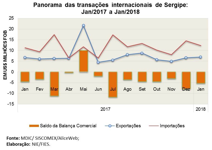 Análise realizada pelo Núcleo de Informações Econômicas (NIE), com o apoio do Centro Internacional de Negócios – CIN/SE, da Federação das Indústrias do Estado de Sergipe (FIES), com base nos dados do Ministério de Desenvolvimento, Indústria e Comércio Exterior (MDIC), apontou que as exportações, em janeiro de 2018, somaram US$ 6,9 milhões, avançando 4,4%, quando comparado com o mês de janeiro de 2017, já na comparação com o mês imediatamente anterior (dezembro/2017) o crescimento chegou aos 5,9%. Enquanto isso, as importações ultrapassaram os US$ 12,2 milhões, crescimento de 9,3%, em relação ao mesmo mês do ano passado, porém com redução de 15,5%, quando comparado com as importações de dezembro de 2017. Por fim, o saldo da balança comercial, no primeiro mês do ano, ficou deficitário, fechando o mês com saldo negativo em US$ 5,3 milhões.