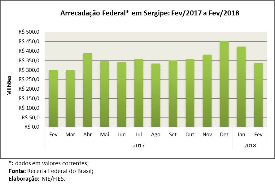 Análise realizada pelo Boletim Sergipe Econômico, parceria do Núcleo de Informações Econômicas (NIE) da Federação das Indústrias do Estado de Sergipe (FIES) e do Departamento de Economia da UFS, com base nos dados da Receita Federal, verificou que a arrecadação de tributos federais, do segundo mês do ano, totalizou R$ 336,4 milhões, assinalando recuo real de 20,9%, quando comparado com a arrecadação do mês imediatamente anterior, janeiro de 2018. Entretanto, no comparativo com a arrecadação do mês de fevereiro do ano passado, observou-se crescimento real de 8,7%. As variações em termos reais, consideram os efeitos da inflação no período, medido pelo Índice Nacional de Preço ao Consumidor Amplo (IPCA).
