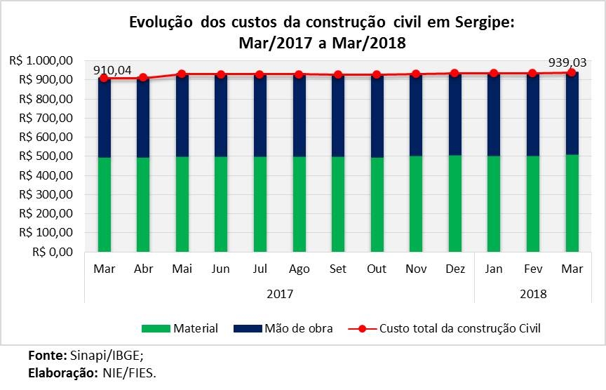 Em termos absolutos, o valor do custo médio por metro quadrado, no mês analisado, ficou em R$ 939,03, sendo o menor custo registrado entre os estados brasileiros, no mês em análise. Tal índice quando comparado com março de 2017, apresenta uma elevação de 3,2% no custo, em termos absolutos, ou seja, sem considerar os efeitos da inflação no período.