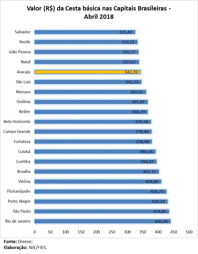 Análise realizada pelo Boletim Sergipe Econômico, parceria do Núcleo de Informações Econômicas (NIE) da Federação das Indústrias do Estado de Sergipe (FIES) e do Departamento de Economia da UFS, com base nos dados da Pesquisa Nacional da Cesta Básica, realizada pelo Departamento Intersindical de Estatística e Estudos Socioeconômicos (DIEESE), apontou que o valor da cesta básica registrado na capital sergipana, ficou em R$ 342,39, em abril de 2018, o quinto menor entre as capitais pesquisadas. Na comparação com o mês anterior (março/2018), a cesta básica aracajuana ficou 0,77% mais cara, variação em termos absolutos, ou seja, sem considerar a inflação do período. Além de Aracaju, outras 10 capitais pesquisadas registraram alta nos valores das suas cestas básicas, em igual período de comparação, sendo que as maiores altas foram registradas em Goiânia (1,49%), Salvador (0,79%) e Aracaju (0,77%). Entretanto, dentre as capitais que apresentaram quedas, as maiores baixas foram registradas em João Pessoa (-4,02%) e Recife (-2,73%).