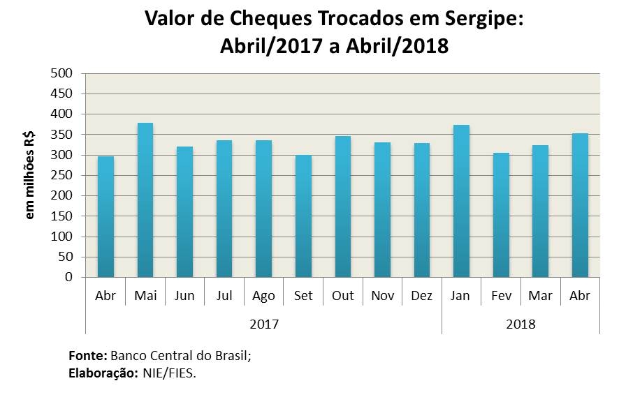Análise realizada pelo Boletim Sergipe Econômico, parceria do Núcleo de Informações Econômicas (NIE) da Federação das Indústrias do Estado de Sergipe (FIES) e do Departamento de Economia da UFS, com base nos dados do Serasa Experian, mostra que foram compensados 146.400 cheques em Sergipe, no mês de abril do ano corrente. Esta quantidade foi 3% superior à registrada no mesmo mês do ano passado, e superior em 4,2%, quando comparado com o mês de março de 2018.