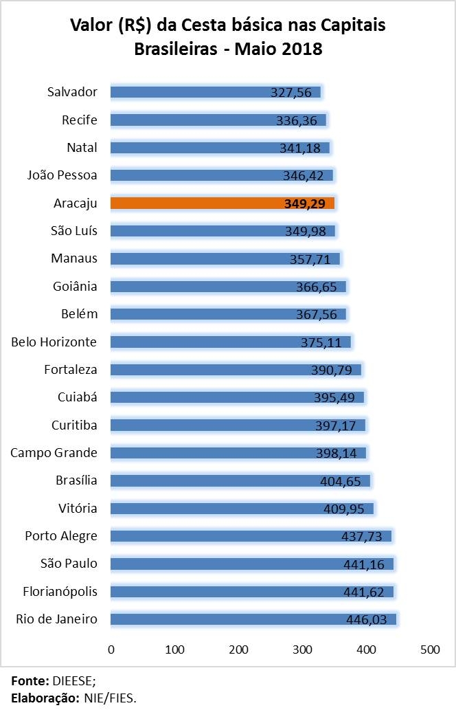 Análise realizada pelo Boletim Sergipe Econômico, parceria do Núcleo de Informações Econômicas (NIE) da Federação das Indústrias do Estado de Sergipe (FIES) e do Departamento de Economia da UFS, com base nos dados da Pesquisa Nacional da Cesta Básica, realizada pelo Departamento Intersindical de Estatística e Estudos Socioeconômicos (DIEESE), apontou que o valor da cesta básica aracajuana, ficou em R$349,29, em maio de 2018, o quinto menor entre as capitais pesquisadas. Na comparação com o mês anterior (abril/2018), a cesta básica aracajuana registrou elevação de 2%.