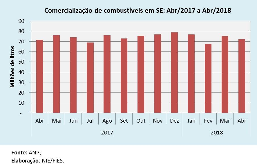 Análise realizada pelo Boletim Sergipe Econômico, parceria do Núcleo de Informações Econômicas (NIE) da Federação das Indústrias do Estado de Sergipe (FIES) e do Departamento de Economia da UFS, com base nos dados da Agência Nacional do Petróleo, Gás Natural e Biocombustíveis (ANP), indicou que as vendas totais de combustíveis, no quarto mês do ano, totalizaram pouco mais de 72 milhões de litros, assinalando leve alta de 0,9%, em relação ao mesmo mês de 2017. No entanto, em relação ao mês imediatamente anterior, março deste ano, as vendas totais recuaram 4,3%. Com os dados de abril último, as vendas acumuladas no ano chegaram a 291,4 milhões de litros, assinalando leve recuo de 1% sobre o mesmo período do ano passado.