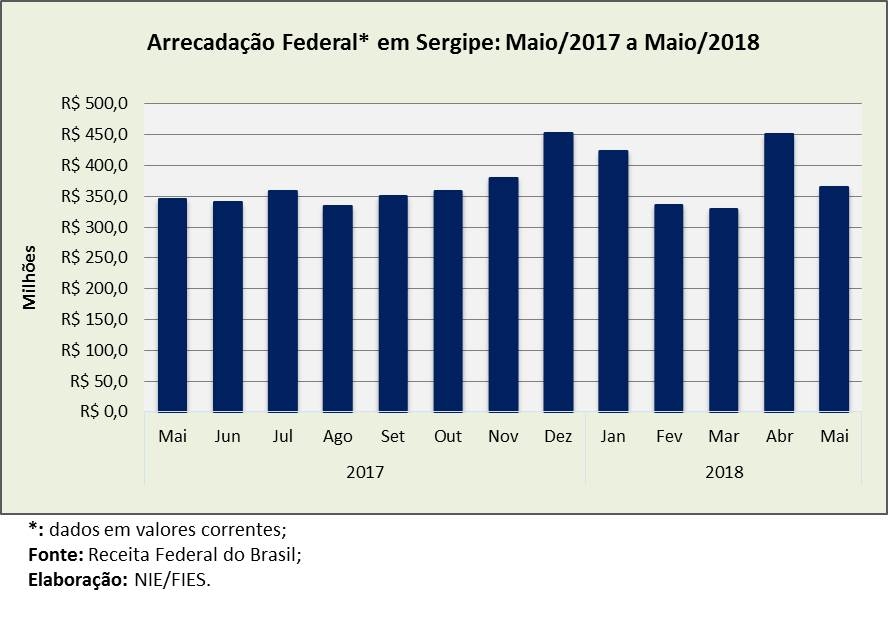 Análise realizada pelo Boletim Sergipe Econômico, parceria do Núcleo de Informações Econômicas (NIE) da Federação das Indústrias do Estado de Sergipe (FIES) e do Departamento de Economia da UFS, com base nos dados da Receita Federal, verificou que a arrecadação de tributos federais, no mês de maio do ano corrente, apesar de ter superado os R$ 365 milhões, recuo 19,1%, em termos reais, quando comparado com a arrecadação do mês imediatamente anterior, abril de 2018. Entretanto, no comparativo com a arrecadação do mês de maio do ano passado, observou-se crescimento real de 5,5%. As variações são em termos reais, consideram os efeitos da inflação no período, medido pelo Índice Nacional de Preço ao Consumidor Amplo (IPCA).