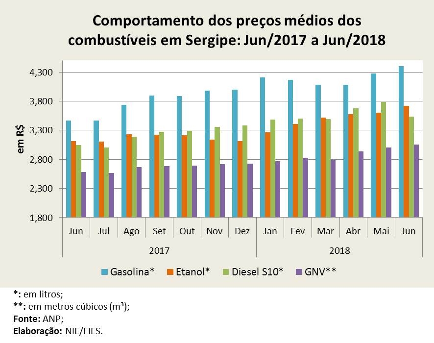 O preço médio do litro fornecido pelas distribuidoras aos postos de combustíveis, no estado, foi de R$ 4,056 para a gasolina, registrando aumento de 31,9%. O etanol teve preço médio de R$ 3,282, com alta de 18,4%. Já o preço médio do óleo diesel ficou em R$ 3,192, assinalando alta de 24%. Todas as comparações são em relação junho de 2017.