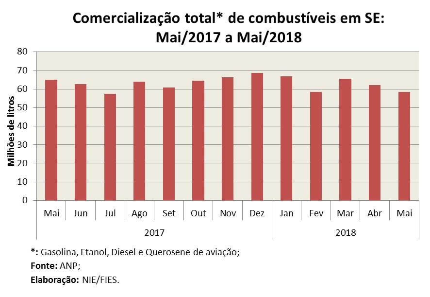 No entanto, considerando todos os combustíveis (gasolina, etanol, diesel e querosene de aviação), as vendas totalizaram 58,4 milhões de litros, registrando recuo de 10,1% em relação a maio de 2017.