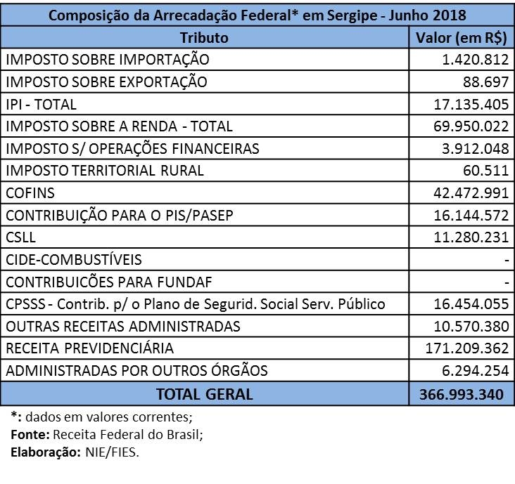 Análise realizada pelo Boletim Sergipe Econômico, parceria do Núcleo de Informações Econômicas (NIE) da Federação das Indústrias do Estado de Sergipe (FIES) e do Departamento de Economia da UFS, com base nos dados da Receita Federal, revelou que a arrecadação de tributos federais, em junho deste ano, alcançou aproximadamente R$ 367 milhões.