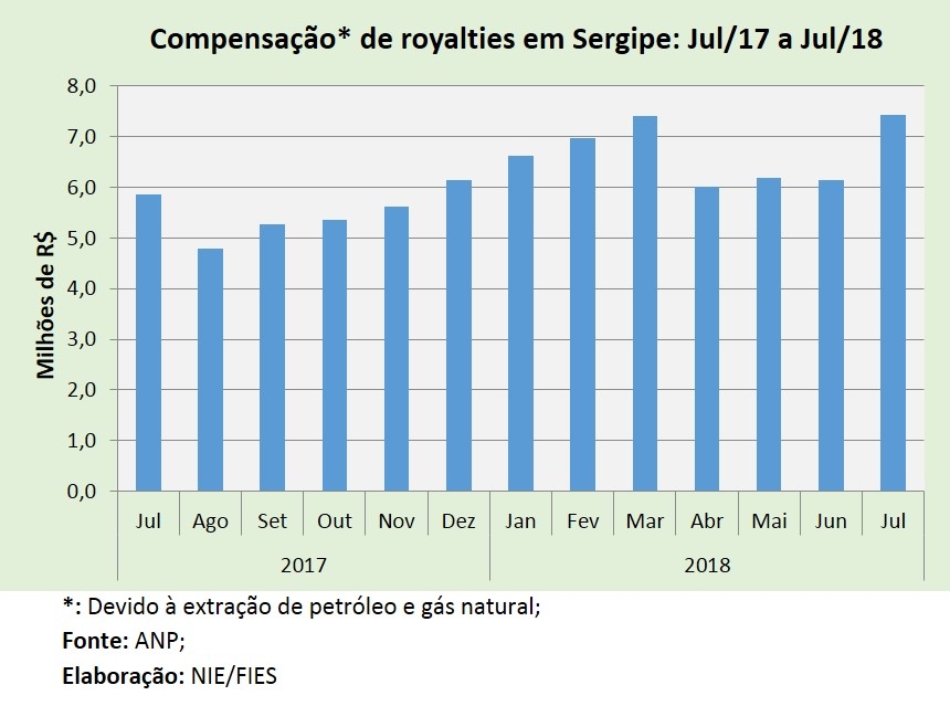 Análise realizada pelo Boletim Sergipe Econômico, parceria do Núcleo de Informações Econômicas (NIE) da Federação das Indústrias do Estado de Sergipe (FIES) e do Departamento de Economia da UFS, com base nos dados da Agência Nacional do Petróleo, Gás Natural e Biocombustíveis (ANP), mostrou que o pagamento de royalties referentes à extração de petróleo e gás natural ao Estado de Sergipe, no sétimo mês do ano, ultrapassou os R$ 7,4 milhões.