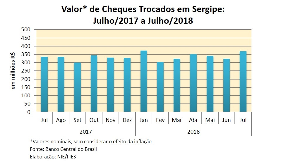 Análise realizada pelo Boletim Sergipe Econômico, parceria do Núcleo de Informações Econômicas (NIE) da Federação das Indústrias do Estado de Sergipe (FIES) e do Departamento de Economia da UFS, com base nos dados do Banco Central, mostra que foram compensados mais de 142 mil cheques em Sergipe, no mês de julho do ano corrente.