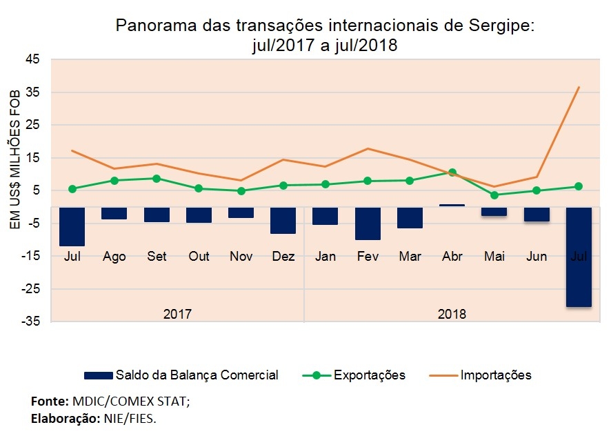 Análise realizada pelo Centro Internacional de Negócios – CIN/SE, com apoio do Núcleo de Informações Econômicas (NIE), da Federação das Indústrias do Estado de Sergipe (FIES), com base nos dados do Ministério de Desenvolvimento, Indústria e Comércio Exterior (MDIC), apontou que as exportações, em julho de 2018, somaram aproximadamente US$ 6,3 milhões, aumentando 14,4%, quando comparado com o mês de julho do ano passado, e na comparação com o mês imediatamente anterior (junho/2018) o aumento chegou a 26,6%. Enquanto isso, as importações ficaram em US$ 36,6 milhões, com avanço de 112,2%, em relação ao mesmo mês do ano passado, já na comparação com as importações de junho de 2018 o aumento ficou em 296,2%. Por fim, o saldo da balança comercial, no sétimo mês do ano, ficou deficitário, fechando o mês com saldo negativo de US$ 30,2 milhões.