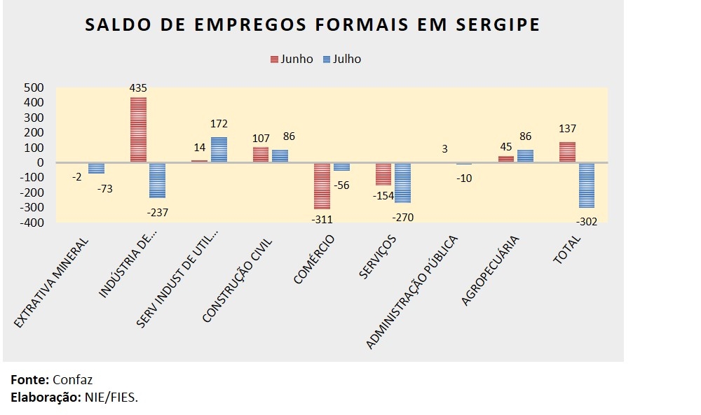 Análise realizada pelo Boletim Sergipe Econômico, parceria do Núcleo de Informações Econômicas (NIE) da Federação das Indústrias do Estado de Sergipe (FIES) e do Departamento de Economia da UFS, com dados do Cadastro Geral de Empregados e Desempregados (Caged), do Ministério do Trabalho e Previdência Social (MTPS), indicou que, no sétimo mês do ano, houve saldo negativo de 302 empregos formais no estado. O saldo é fruto da diferença entre admissões (6.617) e desligamentos (6.919), no período.