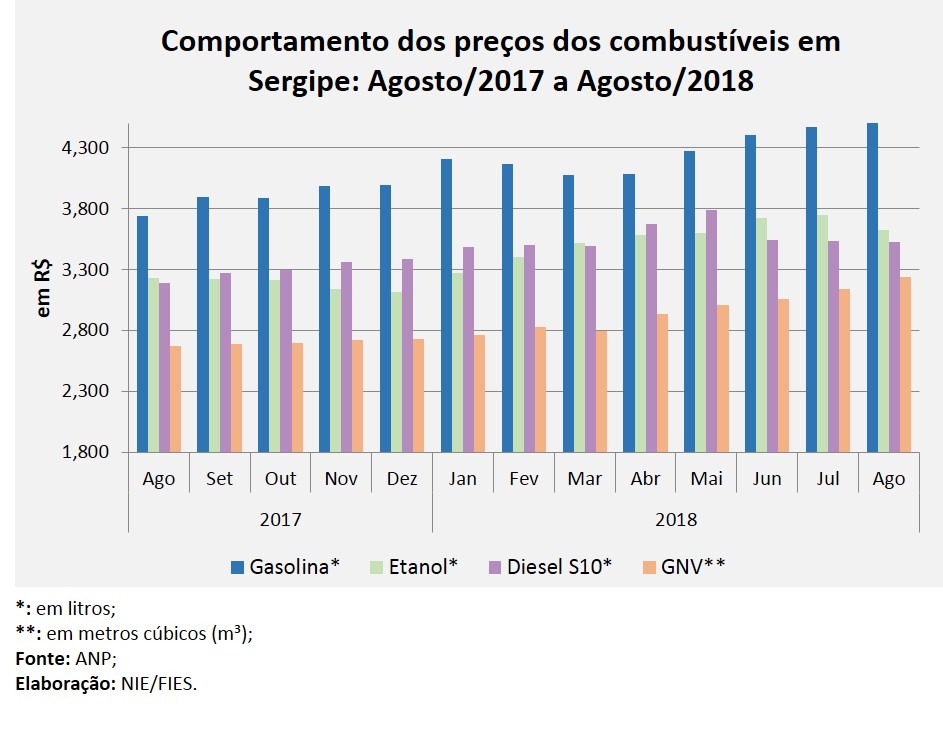 O preço médio do litro fornecido pelas distribuidoras aos postos de combustíveis, no estado, foi de R$ 4,112 para a gasolina, registrando aumento de 22,3%. O etanol teve preço médio de R$ 3,022, com alta de 7,5%. Já o preço médio do óleo diesel ficou em R$ 3,183, assinalando alta de 15,2%. Todas as comparações são em relação a agosto de 2017.
