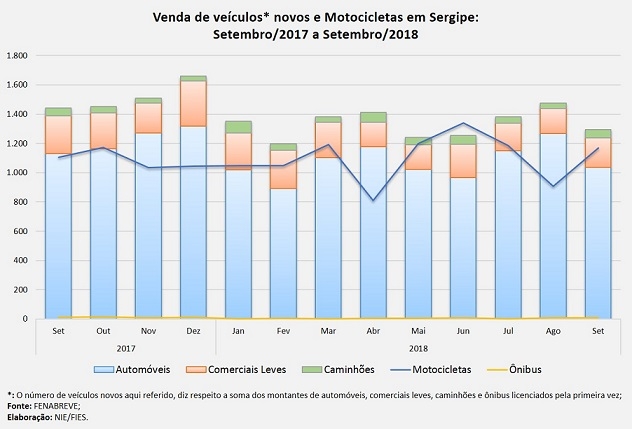 Análise realizada pelo Boletim Sergipe Econômico, parceria do Núcleo de Informações Econômicas (NIE) da Federação das Indústrias do Estado de Sergipe (FIES) e do Departamento de Economia da UFS, com base nos dados da Federação Nacional da Distribuição de Veículos Automotores (FENABRAVE), indicou que as vendas de veículos novos no estado totalizaram 1.307 unidades, em setembro deste ano.