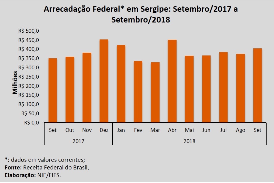 Análise realizada pelo Boletim Sergipe Econômico, parceria do Núcleo de Informações Econômicas (NIE) da Federação das Indústrias do Estado de Sergipe (FIES) e do Departamento de Economia da UFS, com base nos dados da Receita Federal, verificou que a arrecadação de tributos federais, no mês de setembro do ano corrente, superou os R$ 404 milhões, avançando 7,8%, em termos reais, quando comparado com a arrecadação do mês imediatamente anterior, agosto de 2018. No comparativo com a arrecadação do mês de setembro do ano passado, observou-se crescimento real de 10,4%. As variações em termos reais consideram os efeitos da inflação no período, que são medidos pelo Índice Nacional de Preço ao Consumidor Amplo (IPCA).