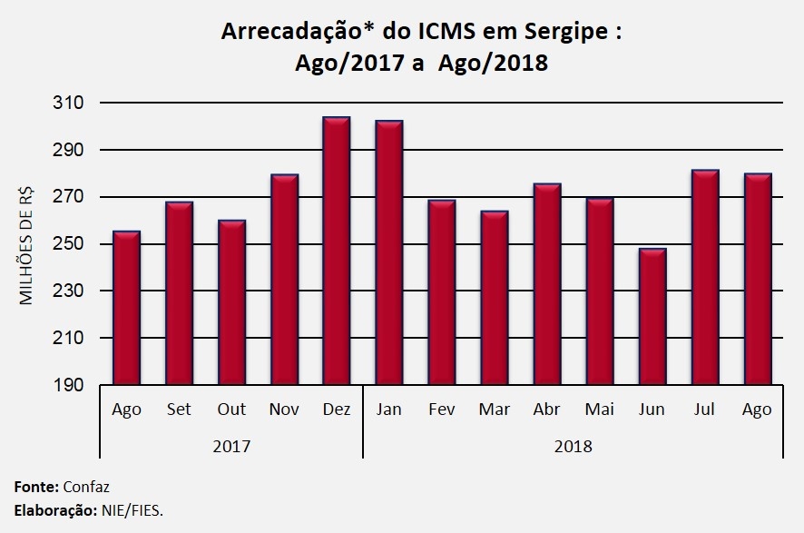 Análise realizada pelo Boletim Sergipe Econômico, parceria do Núcleo de Informações Econômicas (NIE) da Federação das Indústrias do Estado de Sergipe (FIES) e do Departamento de Economia da UFS, com base nos dados do Conselho Nacional da Política Fazendária (Confaz), apontou que a arrecadação do Imposto sobre Circulação de Mercadorias e Prestação de Serviços (ICMS), em Sergipe, ultrapassou os R$ 279,4 milhões, em agosto deste ano.