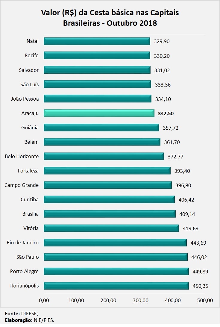 Análise realizada pelo Boletim Sergipe Econômico, parceria do Núcleo de Informações Econômicas (NIE) da Federação das Indústrias do Estado de Sergipe (FIES) e do Departamento de Economia da UFS, com base nos dados da Pesquisa Nacional da Cesta Básica, realizada pelo Departamento Intersindical de Estatística e Estudos Socioeconômicos (DIEESE), apontou que o valor da cesta básica aracajuana, ficou em R$ 342,50, em outubro deste ano. O custo registrado foi o sexto menor entre as dezoito capitais pesquisadas.