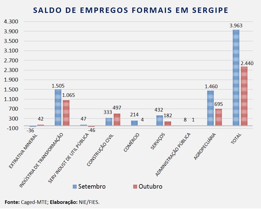 Análise realizada pelo Boletim Sergipe Econômico, parceria do Núcleo de Informações Econômicas (NIE) da Federação das Indústrias do Estado de Sergipe (FIES) e do Departamento de Economia da UFS, com base nos dados do Cadastro Geral de empregados e desempregados (Caged) do Ministério do Trabalho e Emprego, revelou que houve saldo positivo de 2.440 vagas de emprego com carteira assinada no Estado, em outubro deste ano. O resultado é fruto da diferença entre admissões (8.667) e desligamentos (6.227).