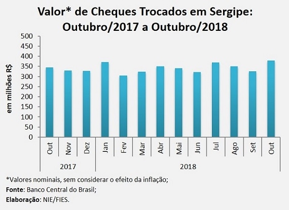 Análise realizada pelo Boletim Sergipe Econômico, parceria do Núcleo de Informações Econômicas (NIE) da Federação das Indústrias do Estado de Sergipe (FIES) e do Departamento de Economia da UFS, com base nos dados do Banco Central, mostra que foram compensados mais de 145 mil cheques em Sergipe, no mês de outubro do ano corrente.