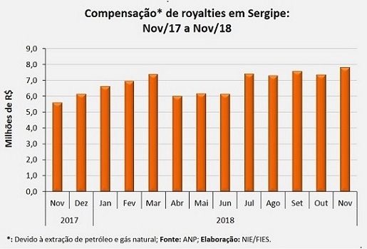 Análise realizada pelo Boletim Sergipe Econômico, parceria do Núcleo de Informações Econômicas (NIE) da Federação das Indústrias do Estado de Sergipe (FIES) e do Departamento de Economia da UFS, com base nos dados da Agência Nacional do Petróleo, Gás Natural e Biocombustíveis (ANP), mostrou que o pagamento de royalties referentes à extração de petróleo e gás natural ao Estado de Sergipe, em novembro do ano corrente, ultrapassou os R$ 7,8 milhões.
