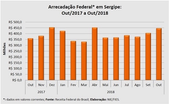 Análise realizada pelo Boletim Sergipe Econômico, parceria do Núcleo de Informações Econômicas (NIE) da Federação das Indústrias do Estado de Sergipe (FIES) e do Departamento de Economia da UFS, com base nos dados da Receita Federal, verificou que a arrecadação de tributos federais, no mês de outubro do ano corrente, superou os R$ 445 milhões, avançando 9,7%, em termos reais, quando comparado com a arrecadação do mês imediatamente anterior, setembro de 2018. No comparativo com a arrecadação do mês de outubro do ano passado, observou-se crescimento real de 18,7%. As variações em termos reais consideram os efeitos da inflação no período, que são medidos pelo Índice Nacional de Preço ao Consumidor Amplo (IPCA).