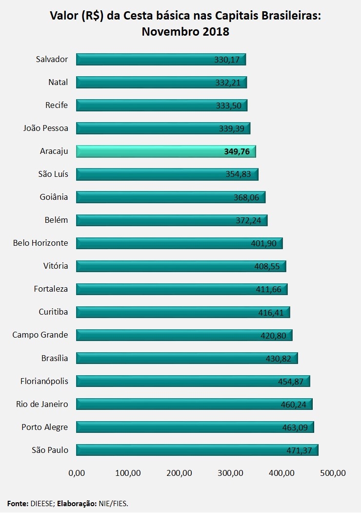 Análise realizada pelo Boletim Sergipe Econômico, parceria do Núcleo de Informações Econômicas (NIE) da Federação das Indústrias do Estado de Sergipe (FIES) e do Departamento de Economia da UFS, com base nos dados da Pesquisa Nacional da Cesta Básica, realizada pelo Departamento Intersindical de Estatística e Estudos Socioeconômicos (DIEESE), apontou que o valor da cesta básica aracajuana ficou em R$ 349,76, em novembro deste ano. O custo registrado foi o quinto menor entre as dezoito capitais pesquisadas.