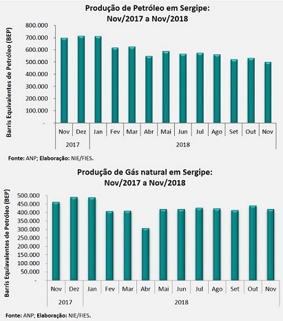 Análise realizada pelo Boletim Sergipe Econômico, parceria do Núcleo de Informações Econômicas (NIE) da Federação das Indústrias do Estado de Sergipe (FIES) e do Departamento de Economia da UFS, com base nos dados da Agência Nacional do Petróleo, Gás Natural e Biocombustíveis (ANP), mostrou que a produção de petróleo no estado, em novembro de 2018, foi de 501,7 mil barris equivalentes de petróleo (BEP), situando-se 5,8% abaixo da produção do mês imediatamente anterior, outubro último.