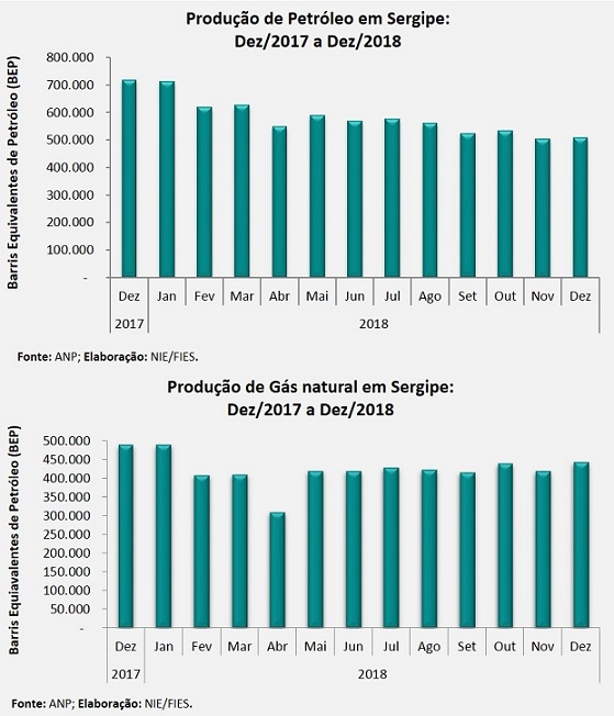 Análise realizada pelo Boletim Sergipe Econômico, parceria do Núcleo de Informações Econômicas (NIE) da Federação das Indústrias do Estado de Sergipe (FIES) e do Departamento de Economia da UFS, com base nos dados da Agência Nacional do Petróleo, Gás Natural e Biocombustíveis (ANP), mostrou que a produção de petróleo no estado, em dezembro de 2018, foi de 506,7 mil barris equivalentes de petróleo (BEP), situando-se 1% acima da produção do mês anterior (novembro/2018).