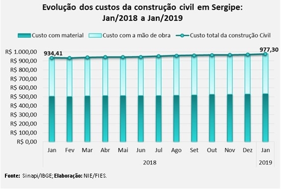 Análise realizada pelo Boletim Sergipe Econômico, parceria do Núcleo de Informações Econômicas (NIE) da Federação das Indústrias do Estado de Sergipe (FIES) e do Departamento de Economia da UFS, com base nos dados do Sistema Nacional de Pesquisa de Custos e Índices da Construção Civil (Sinapi), calculado pelo Instituto Brasileiro de Geografia e Estatística (IBGE) em convênio com a Caixa Econômica Federal, revelou que o custo da construção, medido por metro quadrado (m²), em Sergipe, no mês de janeiro, aumentou 0,8%, quando comparado com o mês imediatamente anterior (dez/2018).
