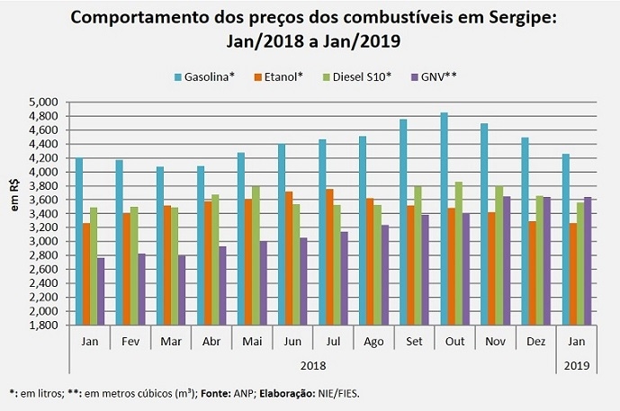 O preço médio do litro fornecido pelas distribuidoras aos postos de combustíveis, do estado, foi de R$ 3,790 para a gasolina, registrando declínio de 5,1%. O etanol teve preço médio de R$ 2,800, assinalando aumento de 3,4%. Em relação ao óleo diesel, o preço médio ficou em R$ 3,133, assinalando baixa de 2,9%. Todas as comparações são em relação ao mês de dezembro de 2018.