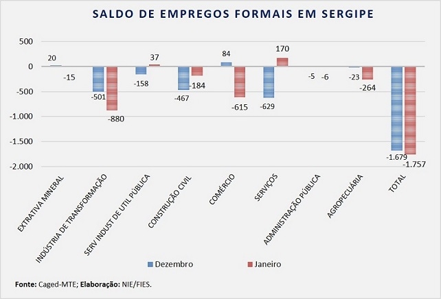 Análise realizada pelo Boletim Sergipe Econômico, parceria do Núcleo de Informações Econômicas (NIE) da Federação das Indústrias do Estado de Sergipe (FIES) e do Departamento de Economia da UFS, com base nos dados do Cadastro Geral de empregados e desempregados (Caged) do Ministério do Trabalho e Emprego, revelou que houve saldo negativo de 1.757 vagas de emprego com carteira assinada no Estado, em janeiro deste ano. O resultado é fruto da diferença entre admissões (6.682) e desligamentos (-8.439) no período.