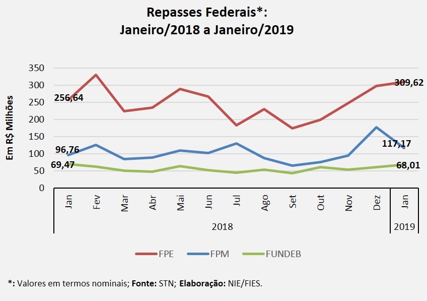 Em termos relativos, quando comparado com janeiro de 2018, o repasse assinalou expansão real de 16,3%, considerando o efeito da inflação, medida pelo Índice Nacional de Preços ao Consumidor Amplo (IPCA). No comparativo com o mês imediatamente anterior (dezembro/2018), houve expansão de 3,7% na transferência do recurso.