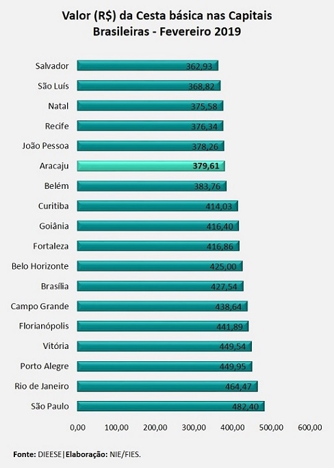 Análise realizada pelo Boletim Sergipe Econômico, parceria do Núcleo de Informações Econômicas (NIE) da Federação das Indústrias do Estado de Sergipe (FIES) e do Departamento de Economia da UFS, com base nos dados da Pesquisa Nacional da Cesta Básica, realizada pelo Departamento Intersindical de Estatística e Estudos Socioeconômicos (DIEESE), apontou que o valor da cesta básica aracajuana ficou em R$ 379,61 em fevereiro deste ano. O custo registrado foi o sexto menor entre as dezoito capitais pesquisadas.