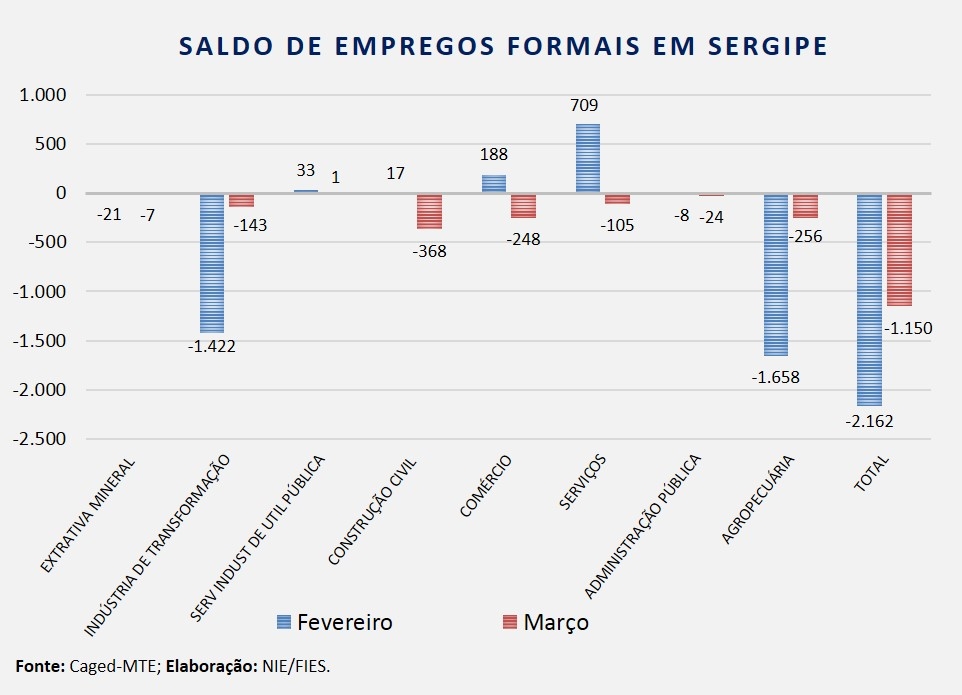 Análise realizada pelo Boletim Sergipe Econômico, parceria do Núcleo de Informações Econômicas (NIE) da Federação das Indústrias do Estado de Sergipe (FIES) e do Departamento de Economia da UFS, com base nos dados do Cadastro Geral de empregados e desempregados (Caged) do Ministério do Trabalho e Emprego, revelou que houve saldo negativo de 1.150 vagas de emprego com carteira assinada no Estado, em março deste ano. O resultado é fruto da diferença entre admissões (6.017) e desligamentos (7.167) no período.