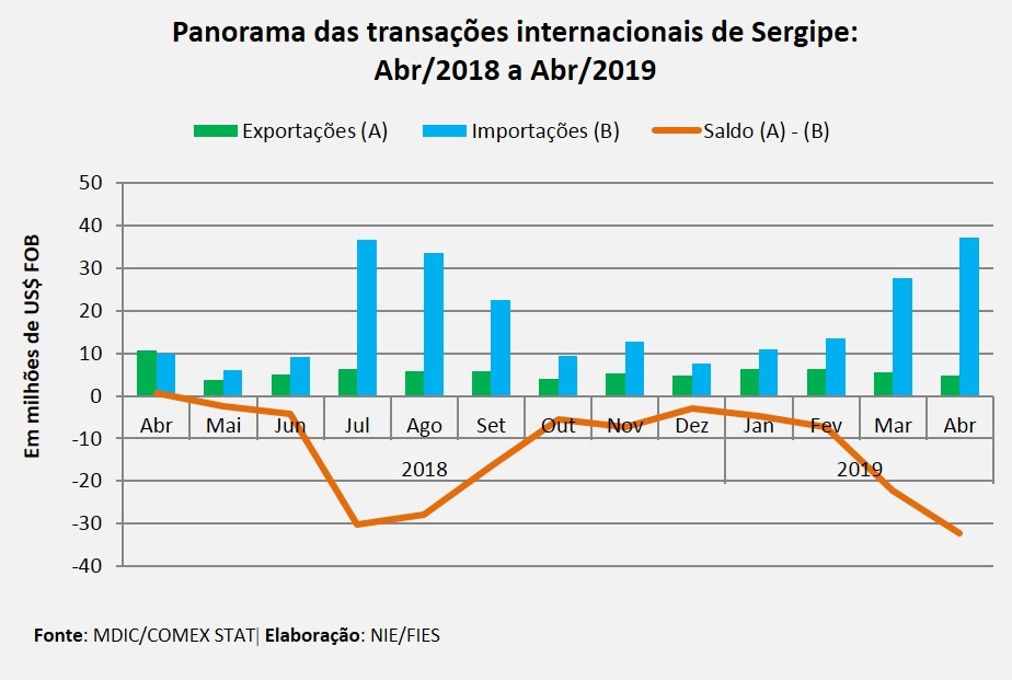 Análise realizada pelo Centro Internacional de Negócios – CIN/SE, da Federação das Indústrias do Estado de Sergipe (FIES), com o apoio do Núcleo de Informações Econômicas (NIE), tendo como base os dados do Ministério de Desenvolvimento, Indústria e Comércio Exterior (MDIC), apontou que as exportações, em abril deste ano, somaram US$ 4,7 milhões, apresentando queda de 55,3%, quando comparado com o mês de abril do ano passado, e decréscimo de 13,8% em relação ao mês imediatamente anterior, março de 2019. Enquanto isso, as importações do mês em análise totalizaram US$ 37,1 milhões, com aumento de 269,5%, no comparativo com o mesmo mês do ano que findou, e aumento de 34,3% quando comparado com as importações de março deste ano. Por fim, o saldo da balança comercial, no quarto mês do ano, ficou deficitário, fechando o mês com saldo negativo de US$ 32,3 milhões.