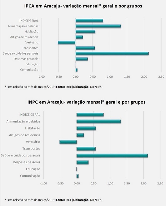 Dentre os nove grupos de produtos e serviços que são analisados para medir o comportamento dos preços para o consumidor na capital sergipana, os grupos de Saúde e cuidados pessoais (+2,13%), Alimentação e bebidas (+1,32%), Habitação (+0,57), Transportes (+0,56%), Despesas pessoais (+0,35%), Artigos de residência (+0,21%) e Comunicação (+0,05%) assinalaram aumento nos preços de março para abril de 2019.