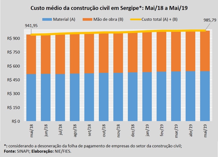 Análise realizada pelo Boletim Sergipe Econômico, parceria do Núcleo de Informações Econômicas (NIE) da Federação das Indústrias do Estado de Sergipe (FIES) e do Departamento de Economia da UFS, com base nos dados do Sistema Nacional de Pesquisa de Custos e Índices da Construção Civil – SINAPI, uma produção conjunta do IBGE e da Caixa Econômica Federal, revelou que o custo médio da construção em Sergipe, por metro quadrado (m²), considerando a desoneração da folha de pagamento de empresas do setor da construção civil, em maio deste ano, registrou acréscimo de 0,1%, quando comparado com o mês imediatamente anterior, abril último. No comparativo com o quinto mês do ano passado, o custo expandiu-se 4,7%.
