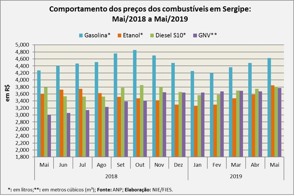 No tocante ao óleo diesel, notou-se que o preço médio, pelo litro do produto, situou-se em R$ 3,701. Em termos comparativos, verificou-se alta de 2,1% em relação ao mês imediatamente anterior (abril/2019) e alta de 1,1% no comparativo com o mesmo mês de 2018.