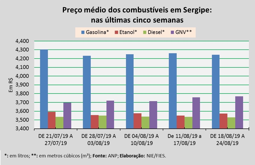 Análise realizada pelo Boletim Sergipe Econômico, parceria do Núcleo de Informações Econômicas (NIE) da Federação das Indústrias do Estado de Sergipe (FIES) e do Departamento de Economia da UFS, com base nos dados da Agência Nacional do Petróleo, Gás Natural e Biocombustíveis (ANP), revelou que na semana de 18 a 24 de agosto, o preço médio da gasolina vendida em Sergipe foi de R$ 4,243, apresentando retração de 0,4%, em relação à semana anterior (11 a 17 de agosto).