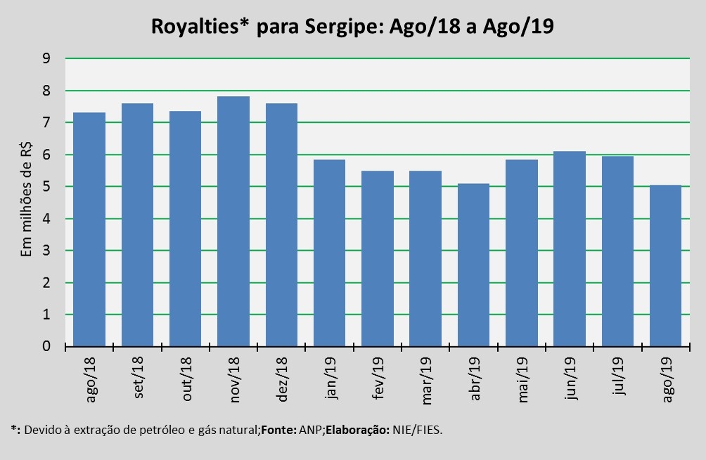 Análise realizada pelo Boletim Sergipe Econômico, parceria do Núcleo de Informações Econômicas (NIE) da Federação das Indústrias do Estado de Sergipe (FIES) e do Departamento de Economia da UFS, com base nos dados da Agência Nacional do Petróleo, Gás Natural e Biocombustíveis (ANP), revelou que o pagamento de royalties ao Estado de Sergipe, referentes à extração de petróleo e gás natural do mês de junho deste ano, ficou em pouco mais de R$ 5 milhões. O valor, segundo a ANP, foi creditado neste mês.