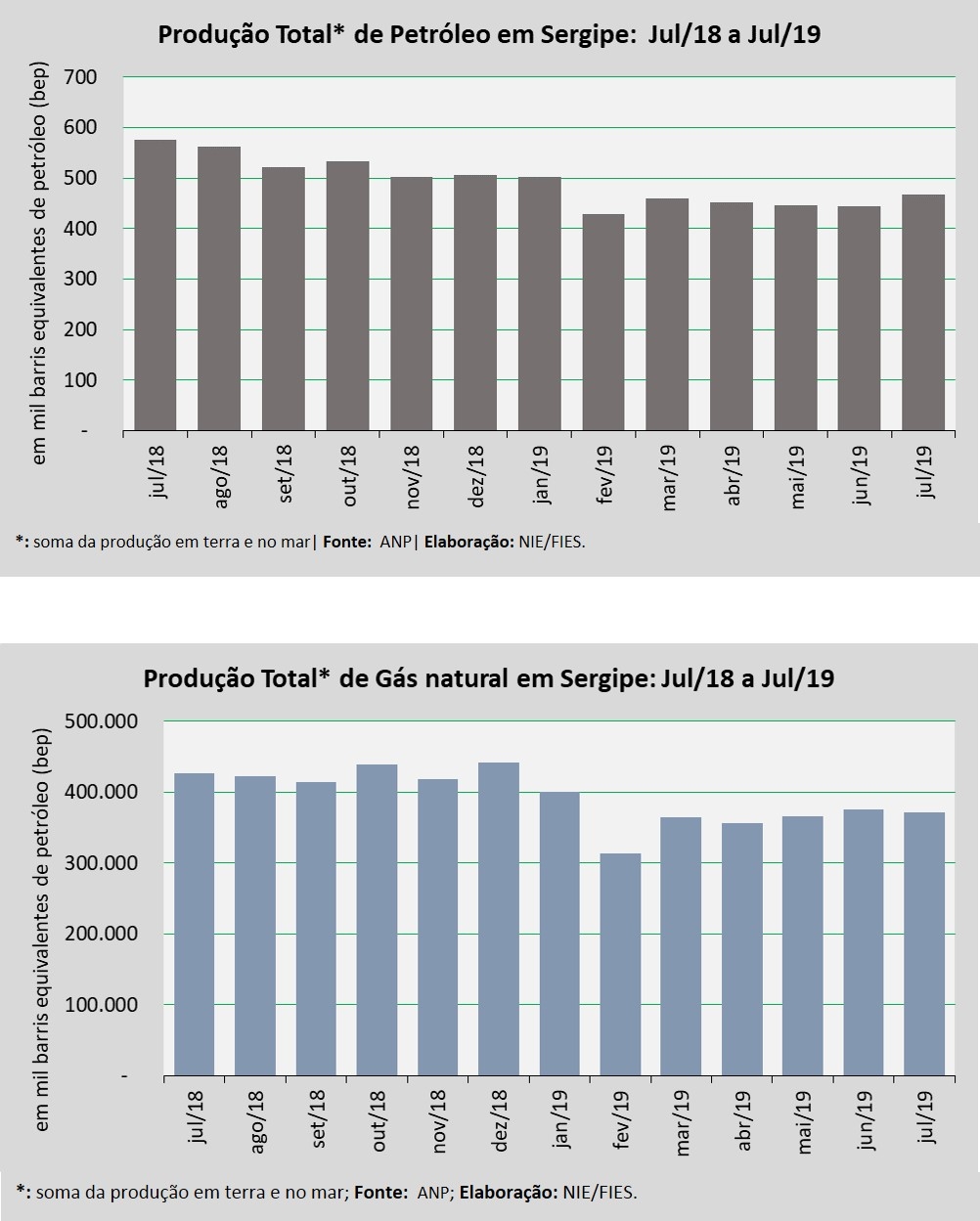 Análise realizada pelo Boletim Sergipe Econômico, parceria do Núcleo de Informações Econômicas (NIE) da Federação das Indústrias do Estado de Sergipe (FIES) e do Departamento de Economia da UFS, com base nos dados da Agência Nacional do Petróleo, Gás Natural e Biocombustíveis (ANP), mostrou que a produção de petróleo no estado, em julho deste ano, foi de 467,7 mil barris equivalentes de petróleo (BEP), situando-se 5,4% acima da produção do mês anterior, junho deste ano. Já no confronto com julho do ano passado, notou-se retração de 18,7% na produção.