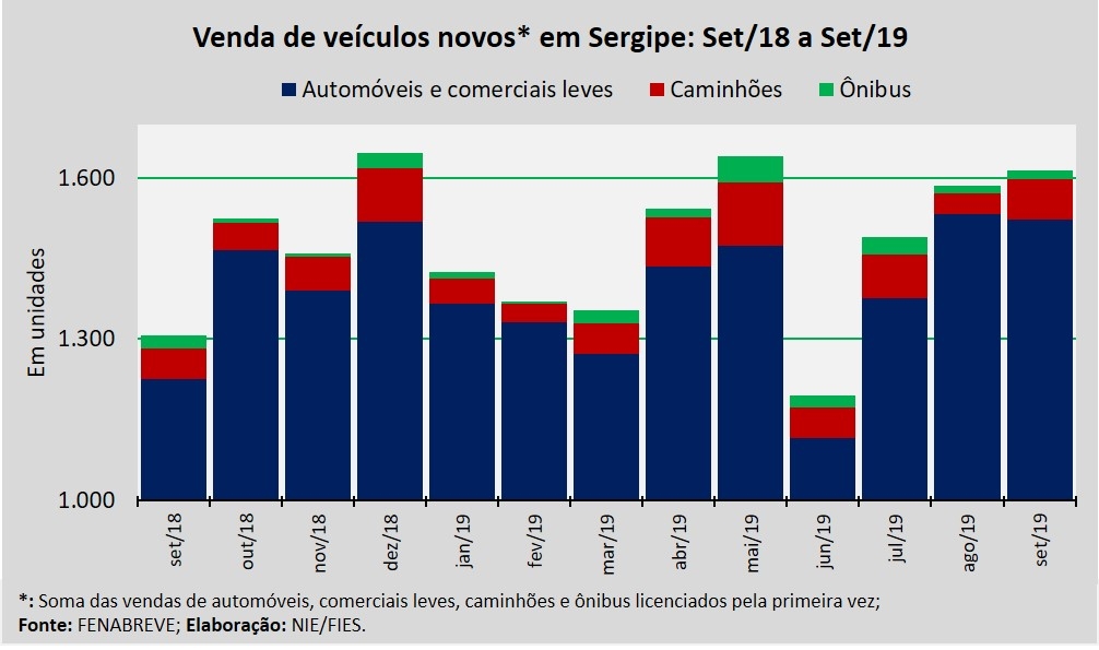 Análise realizada pelo Boletim Sergipe Econômico, parceria do Núcleo de Informações Econômicas (NIE) da Federação das Indústrias do Estado de Sergipe (FIES) e do Departamento de Economia da UFS, com base nos dados da Federação Nacional da Distribuição de Veículos Automotores (FENABRAVE), apontou que as vendas de veículos novos no estado totalizaram 1.614 unidades, em setembro deste ano. Foi o mês com o segundo maior volume de vendas deste ano, abaixo somente do montante registrado em maio último.