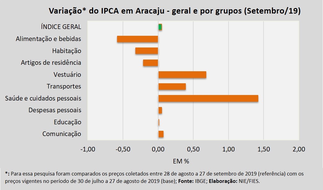Análise realizada pelo Boletim Sergipe Econômico, parceria do Núcleo de Informações Econômicas da Federação das Indústrias do Estado de Sergipe (FIES) e do Departamento de Economia da UFS, com base nos dados do Instituto Brasileiro de Geografia e Estatística (IBGE), revelou que a capital sergipana, em setembro deste ano, teve inflação de 0,05%, medida pelo Índice de Preços ao Consumidor Amplo – IPCA.
