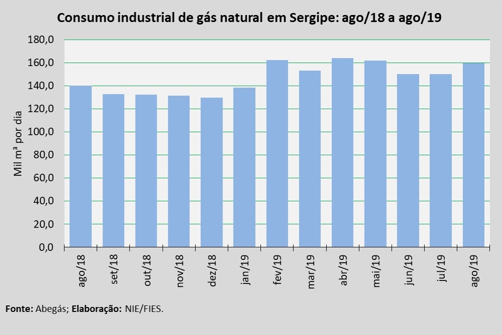 Análise realizada pelo Boletim Sergipe Econômico, parceria do Núcleo de Informações Econômicas (NIE) da Federação das Indústrias do Estado de Sergipe (FIES) e do Departamento de Economia da UFS, com base nos dados da Associação Brasileira das Empresas Distribuidoras de Gás Canalizado (ABEGÁS), apontou que foram consumidos 254,1 mil m³/dia de gás natural em Sergipe, no mês de agosto deste ano.