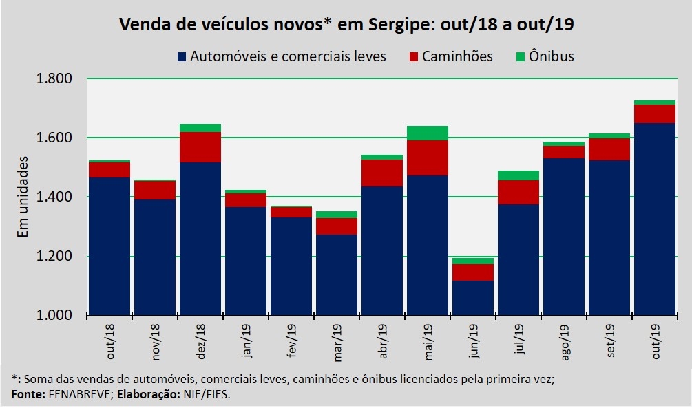 Análise realizada pelo Boletim Sergipe Econômico, parceria do Núcleo de Informações Econômicas (NIE) da Federação das Indústrias do Estado de Sergipe (FIES) e do Departamento de Economia da UFS, com base nos dados da Federação Nacional da Distribuição de Veículos Automotores (FENABRAVE), apontou que as vendas de veículos novos no estado totalizaram 1.727 unidades, em outubro, sendo assim o mês com maior volume de vendas deste ano.
