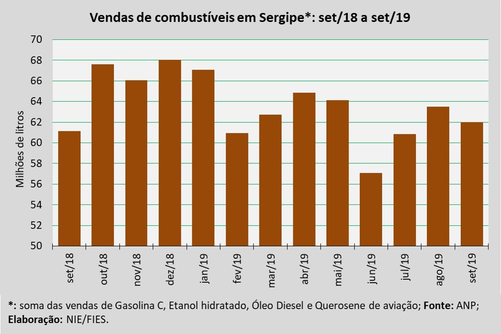 Análise realizada pelo Boletim Sergipe Econômico, parceria do Núcleo de Informações Econômicas (NIE) da Federação das Indústrias do Estado de Sergipe (FIES) e do Departamento de Economia da UFS, com base nos dados da Agência Nacional do Petróleo, Gás Natural e Biocombustíveis (ANP), indicou que as vendas totais de combustíveis, no nono mês do ano, totalizaram pouco mais de 62 milhões de litros, assinalando redução de 2,4% quando comparado com o mês imediatamente anterior, agosto último. Em relação a setembro de 2018, as vendas aumentaram 1,4%.
