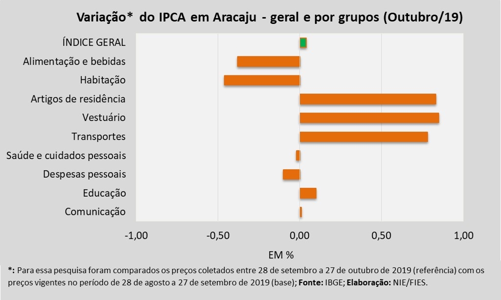 Dentre os nove grupos de produtos e serviços que foram pesquisados para medir o comportamento dos preços, em Aracaju, verificou-se que os grupos de Vestuário (+0,85%), Artigos de residência (+0,83%), Transportes (+0,78%), Educação (+0,10%) e Comunicação (+0,01%), assinalaram aumento nos preços, no período analisado.