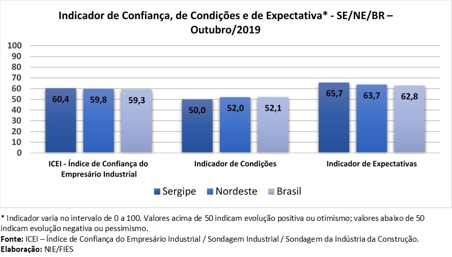 A Sondagem Industrial de Sergipe elaborada pelo Núcleo de Informações Econômicas (NIE), da Federação das Indústrias do Estado de Sergipe (FIES), revelou que a confiança do empresário industrial sergipano continua acima da média histórica, apesar das dificuldades do setor industrial em retomar o crescimento. O ICEI – Índice de Confiança do Empresário Industrial – do décimo mês do ano avançou 1,8 ponto no comparativo com o mês anterior (setembro/2019), alcançando 60,4 pontos.