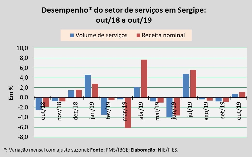 Análise realizada pelo Boletim Sergipe Econômico, parceria do Núcleo de Informações Econômicas (NIE) da Federação das Indústrias do Estado de Sergipe (FIES) e do Departamento de Economia da UFS, com base nos dados da Pesquisa Mensal de Serviços (PMS) do IBGE, revelou que o setor de serviços em Sergipe, em outubro deste ano, apresentou crescimento de 0,7% no volume de serviços prestados, em relação ao último mês de setembro, na série com ajuste sazonal (método utilizado para uniformizar os períodos de comparação). Em relação ao décimo mês do ano passado, o volume de serviços assinalou aumento de 2,9%.