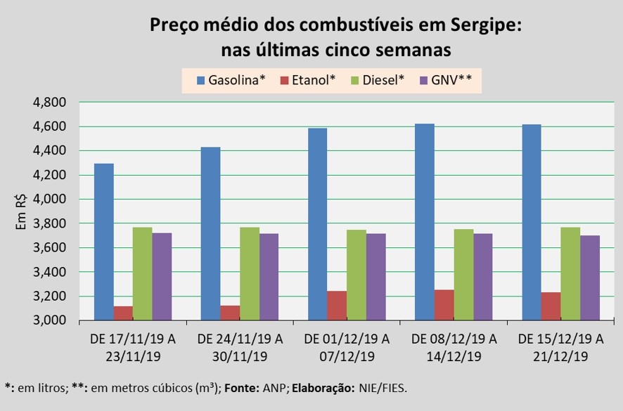 Análise realizada pelo Boletim Sergipe Econômico, parceria do Núcleo de Informações Econômicas (NIE) da Federação das Indústrias do Estado de Sergipe (FIES) e do Departamento de Economia da UFS, com base nos dados da Agência Nacional do Petróleo, Gás Natural e Biocombustíveis (ANP), revelou que na semana de 15 a 21 de dezembro, o preço médio do etanol foi de R$ 3,231, assinalando queda de 0,6% em relação à semana anterior (08 a 14 de novembro).